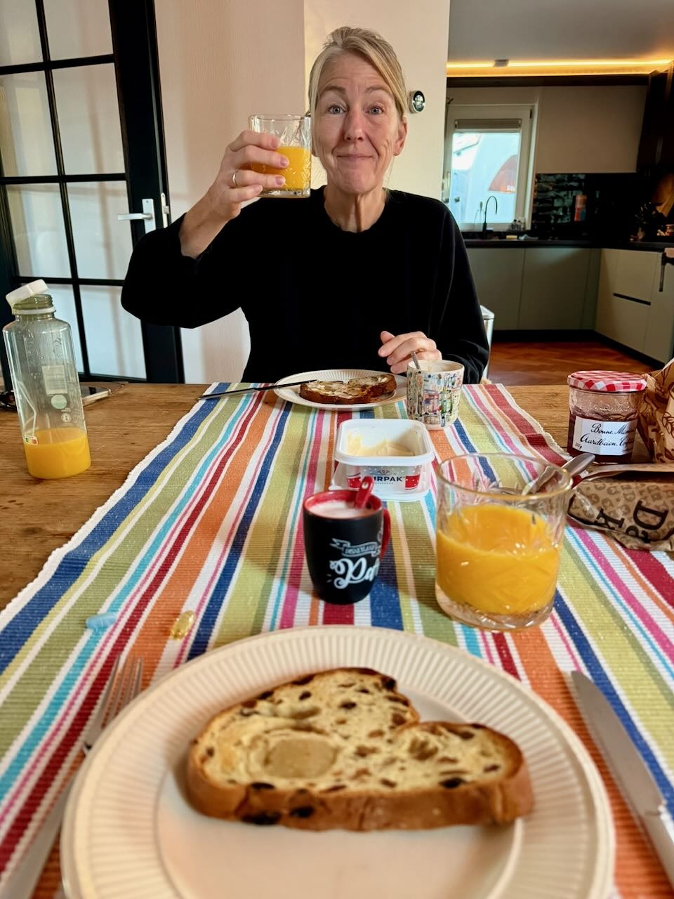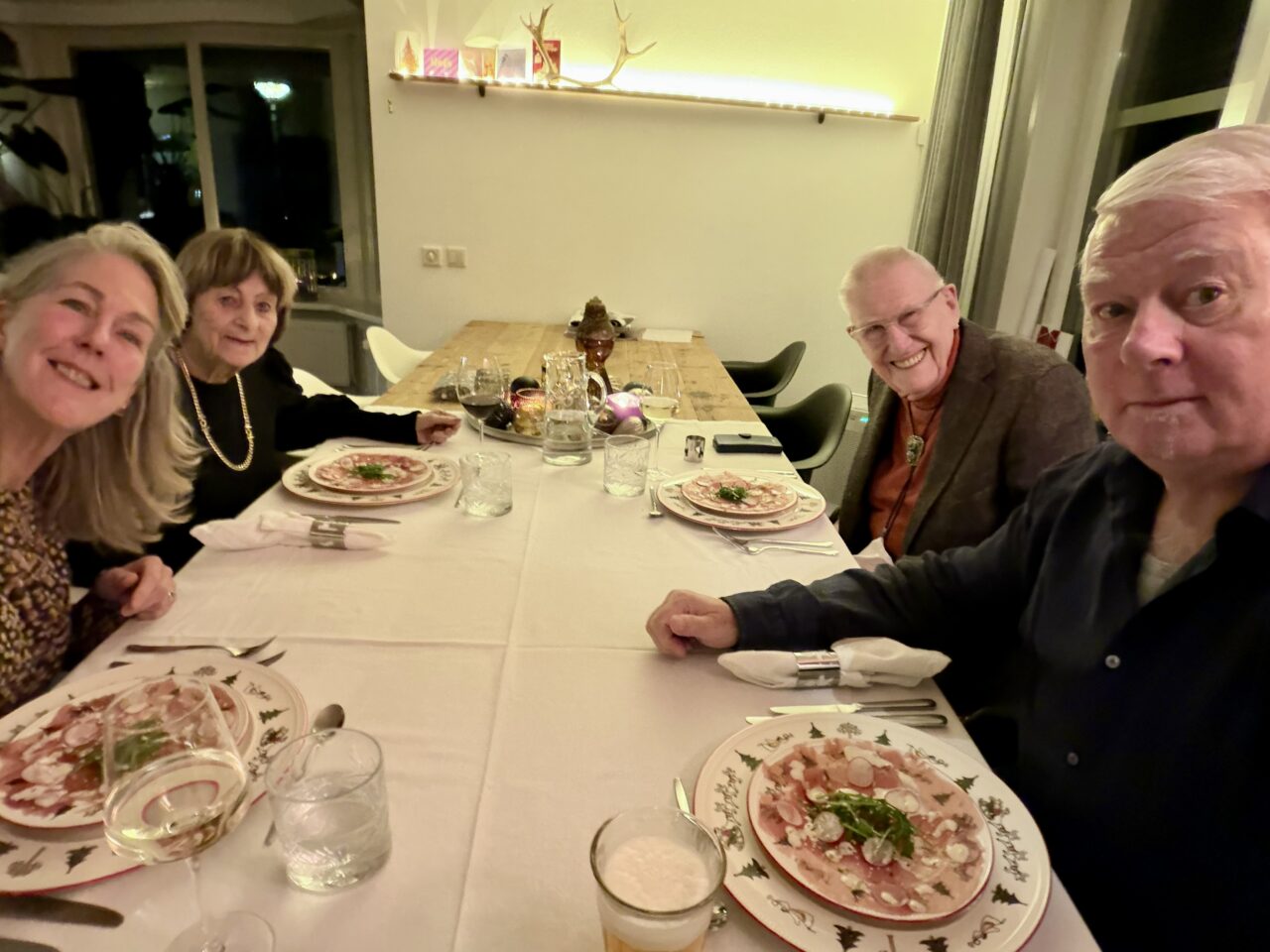 Lekker uitgeslapen tot 9 uur, gedroomd van Emily in Paris / Rome / Venetië. We doen een gezellig kerstontbijt, Siel heeft gedekt, want die was een half uurtje eerder op. Dan gaat Siel aan de kook, wij moeten het voorgerecht doen, Sol & Dirk het nagerecht, en de rest wordt door Selene & Jordi geregeld. Ook nog de cadeautjes inpakken, en om 13:30 gaan we via Almere Poort, waar we Sol & Dirk oppikken naar Utrecht voor het gezamenlijke kerstdiner en natuurlijk uitpakken van de kerstcadeautjes. Heel gezellig. Jordi heeft een mooi filmpje gemaakt van hun trip naar Zuid-Afrika en laat ook nog 100 prachtige foto’s zien. En we doen een Kahoot quiz over hun trip. Leuk. Dan aan het gezamenlijke diner, afgewisseld met cadeautjes uitpakken. Siel heeft het voorgerecht gemaakt, bladerdeeg tompouce met carpaccio en kaassmeersel. Heerlijke. Gevolgd door het hoofdgerecht kiprollade, champignons Wellington, met sperziebonen met spekjes en gebakken aardappeltjes. Sol had een tiramisu met extra citroen gemaakt. Ook heel erg smakelijk. En de cadeautjes vielen natuurlijk ook in de smaak; vooral het speciaal voor mij gekochte shirt van het Zuid-Afrikaanse rugbyteam, de Springboks. Een grote verrassing, net zoals een heel leuk fotoboek. Rond middernacht weer op huis aan, thuis nog een borrel en dus laat naar bed. Het was heel gezellig in Utrecht,
