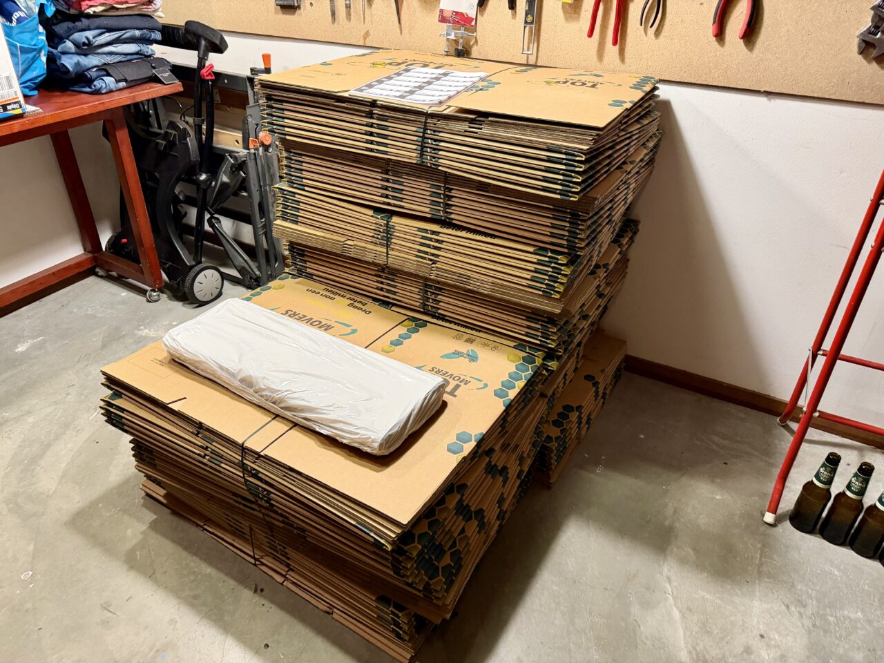 En ook vandaag bijtijds op. De Firma BAS zal tussen 9 en 12 uur alle keuken verpakkingsmateriaal komen ophalen. En dus gaat Siel naar Lelystad. Ze neemt het oude Ikea rek genaamd Peter mee. Al meer dan 30 jaar oud, maar voldoet nog steeds, deels in Utrecht en nu deels in Lelystad. Wie wat bewaard heeft wat. Na BAS gaat Siel met de stofzuiger en de dweil aan de slag. En eind van de ochtend kom Selina het nieuwe huis bewonderen, daarna gaan ze lunchen bij van der Valk. Maakt Siel de vloer daarna nog af. Ik betaal de glazenwasser voor de laatste keer, en krijg alvast 100 verhuisdozen, stickers en vloeipapier geleverd door de verhuizer Holwerda. Ondertussen aan de slag met de belastingen en de vragenlijst van de notaris (kan nu wel ingevuld gaan worden). ’s Avonds aan een soepje. En daarna komt Grutto langs met het bestelde vlees en vis. Dat ziet er weer prima uit.