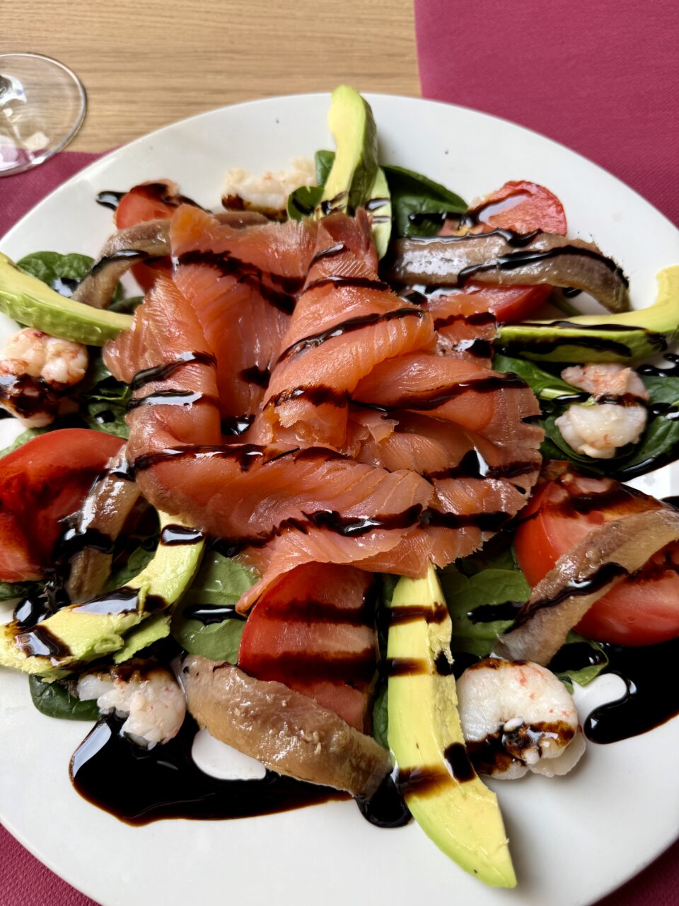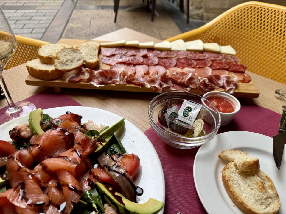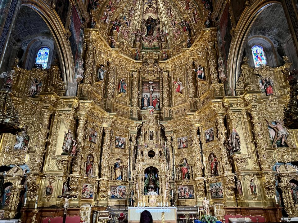 En ook vandaag weer een lekker temperatuurtje, maar wel deels bewolkt. We pakken na het ontbijt de fiets naar Navarrete, en stappen daar op de bus naar Logroño, de hoofdstad van de Rioja. Leuke oude stad, we wandelen door het oude deel. Helaas is de kerk dicht. Veel smalle straatjes met kleine balkonnetjes. Mooi om te zien. De pintxos/tapas zaak waar we 6 jaar geleden waren is helaas dicht, maar er zijn nog 49 andere las ik op Internet. En we vinden een hele leuke. Siel gaat aan een uitgebreide zalmsalade en ik neem een half(!) plankje met salami, choriza, serrano ham, lomo en kaas, wat stokbrood en tomatenprut. Biertje en wijntje erbij en we vermaken ons prima. Dan de bushalte terug opzoeken, die is nl. ergens anders dan op de heenweg. Terug in Navarrete is daar de kerk wel open, dus we kijken daar even naar het gouden altaar. Verbluffend wel, wat een pracht en praal. Kost wel € 1 om het licht aan te doen. Dan stokbroodje scoren en met de fiets weer terug. Nog even buiten nagenieten en dan de luifel in en alles naar binnen. Kans op windkracht 6 met buien om een uur of 5. En we hebben geen zin om er dan uit te moeten, zoals we ooit al een paar keer eerder hebben gedaan. Na het diner, lees stokbroodje met pindakaas cq. hagelslag wordt het tijd voor Chelsea – Ajax. Ik houd mijn hart vast. En terecht; 5-1 (!) verlies.