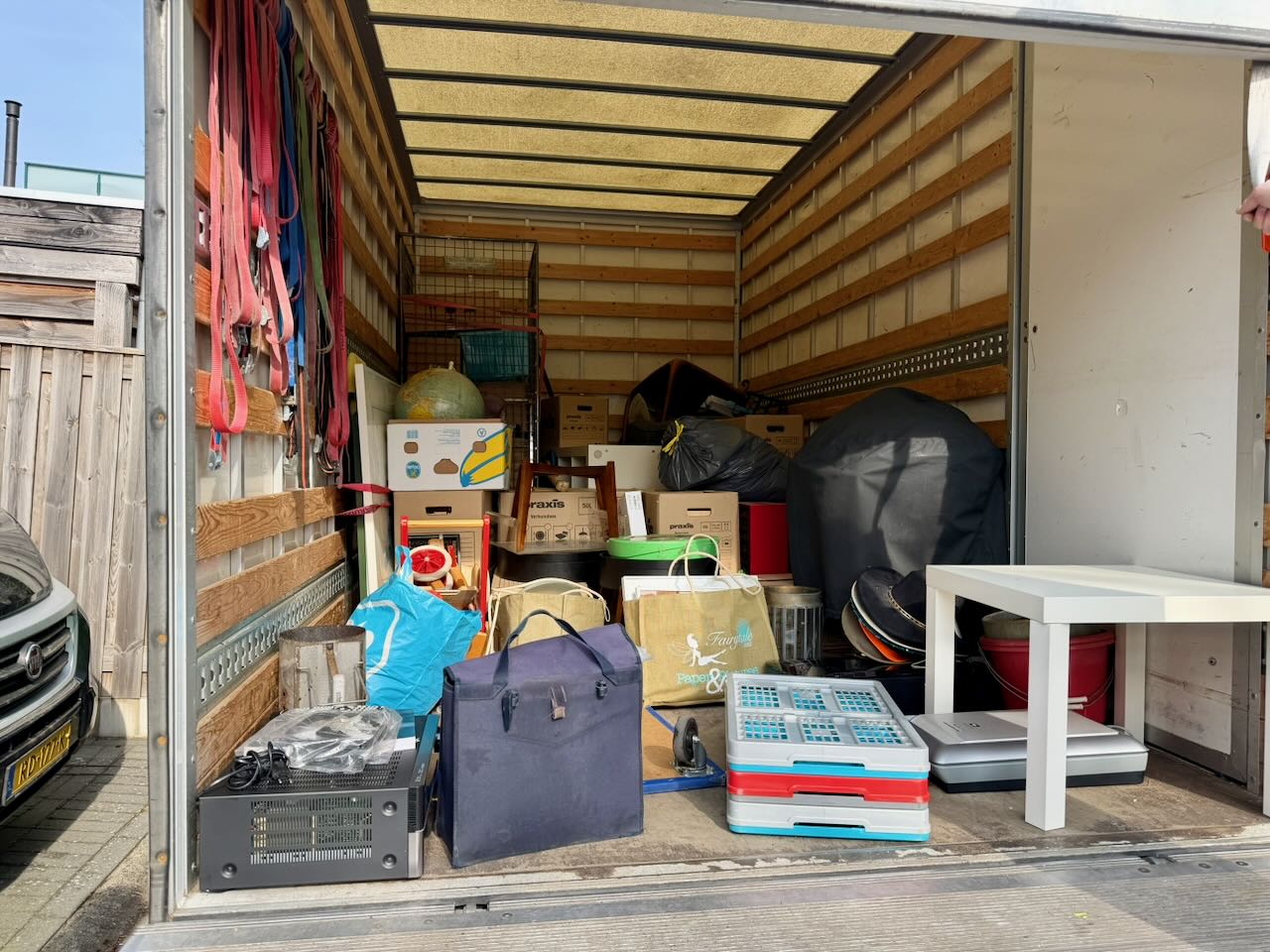 Om half negen aan het ontbijt, daarna de server uit zetten en op naar Lelystad om hem daar te installeren. Maar ook om alvast nog wat meer spullen daar neer te zetten. Rond 12 uur komt er ook iemand van Breman langs. Hij gaat een offerte verzorgen voor een laadpaal, en/of extra zonnepanelen en/of een thuis batterij. Maar eerst een schouw om eea te beoordelen. De opzichter komt ook nog even langs, hij brengt een sleutel terug en verhelpt een probleem met het loszittende paneel van de zonnepanelen gateway, en het probleem met een openslaande deur in de slaapkamer. Wij ruimen daarna op, Siel monteert nog 4 lades in de Pax kast en ik het lampje. Dan nog wat Stucloper neerleggen en vervolgens weer huiswaarts. Om 14:15 staat er een grote auto van de Kringloper voor de deur, die gaat weer vol weg. De garage en de oprit zijn weer grotendeels leeg. En bij de Kringloper was het rustig met de inbreng de laatste dagen dus dat komt mooi uit. We stoppen de laatste dingen nog in de laatste dozen. Die zijn nu alle 160 gebruikt nu. Daarna nog de vloerkleden oprollen, de kapstok demonteren en de banken uit elkaar schroeven. Morgen nog het bed doen, en de woonkamertafel uit elkaar slaan. Maar daar zijn de verhuizers bij nodig. Om 18:45 zijn we het zat en pakken we de fiets naar Le Baron. Een Vega burger en een Saté betaald met Markplaats geld! En dan vroeg naar bed. Morgen om 7 uur staan ze voor de deur.