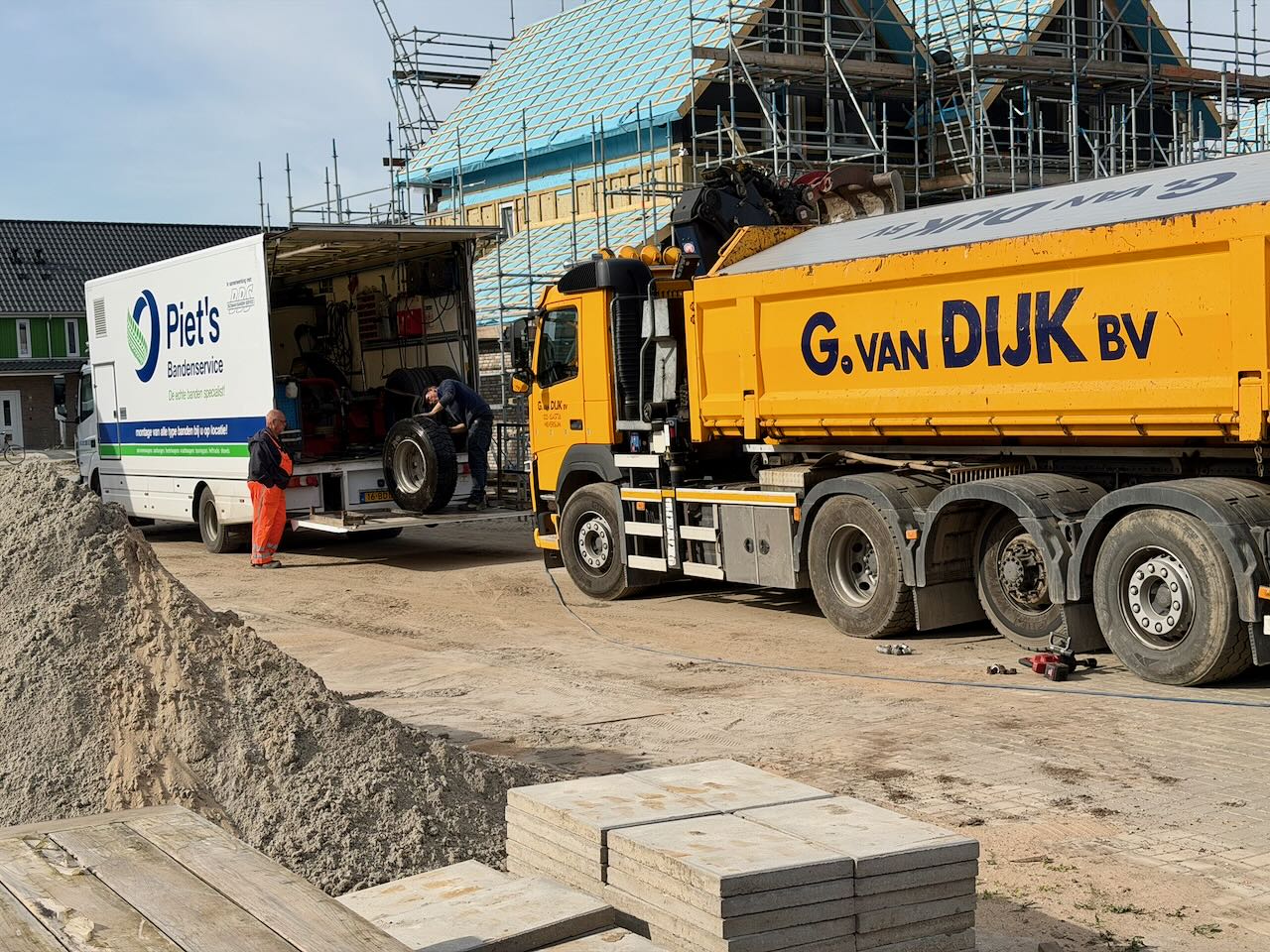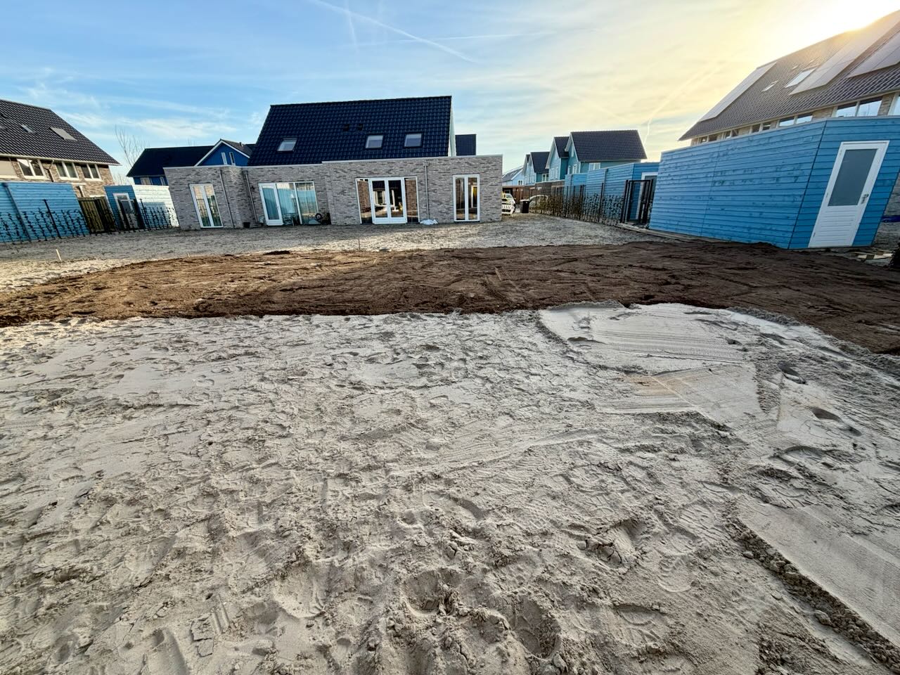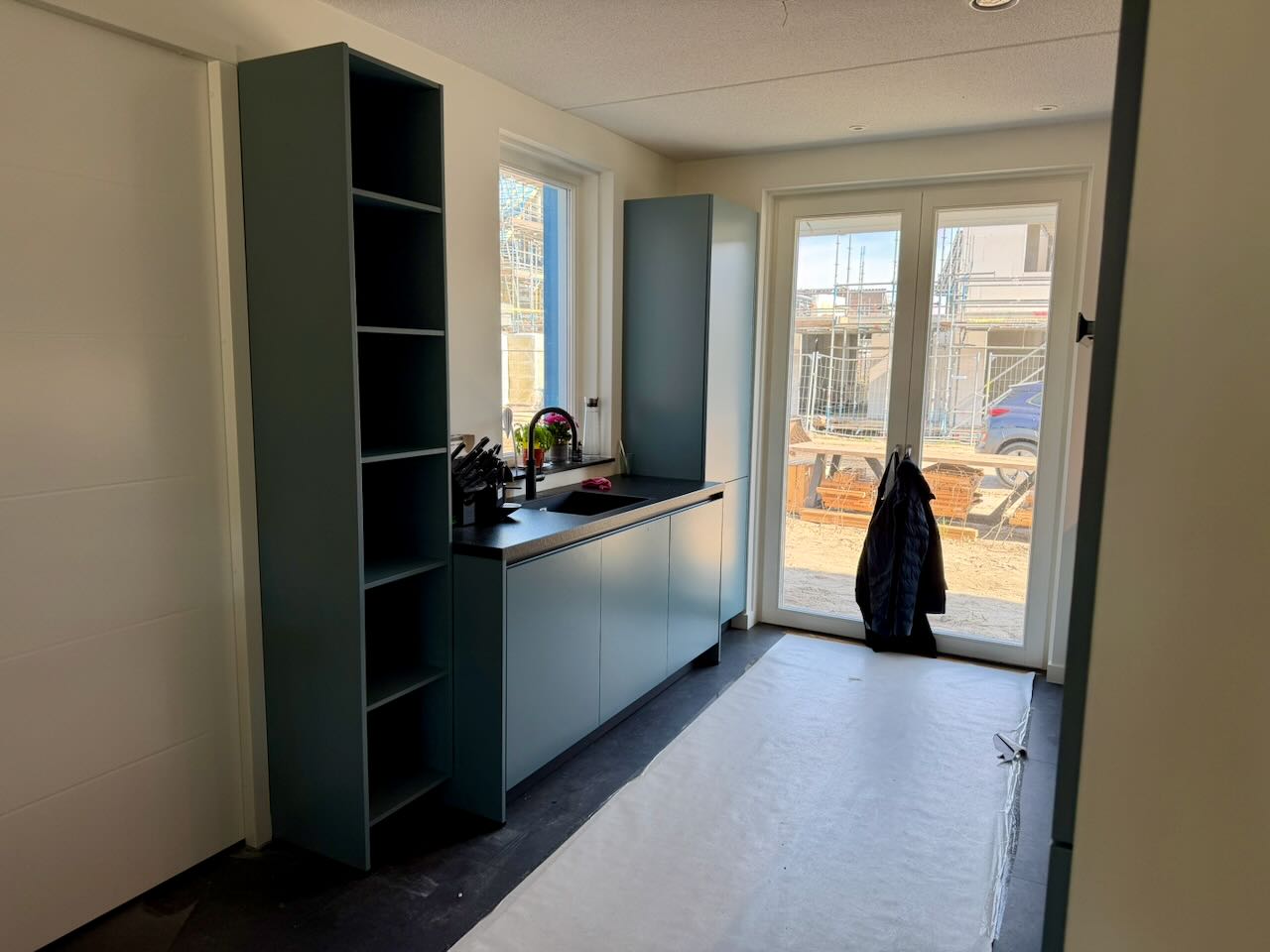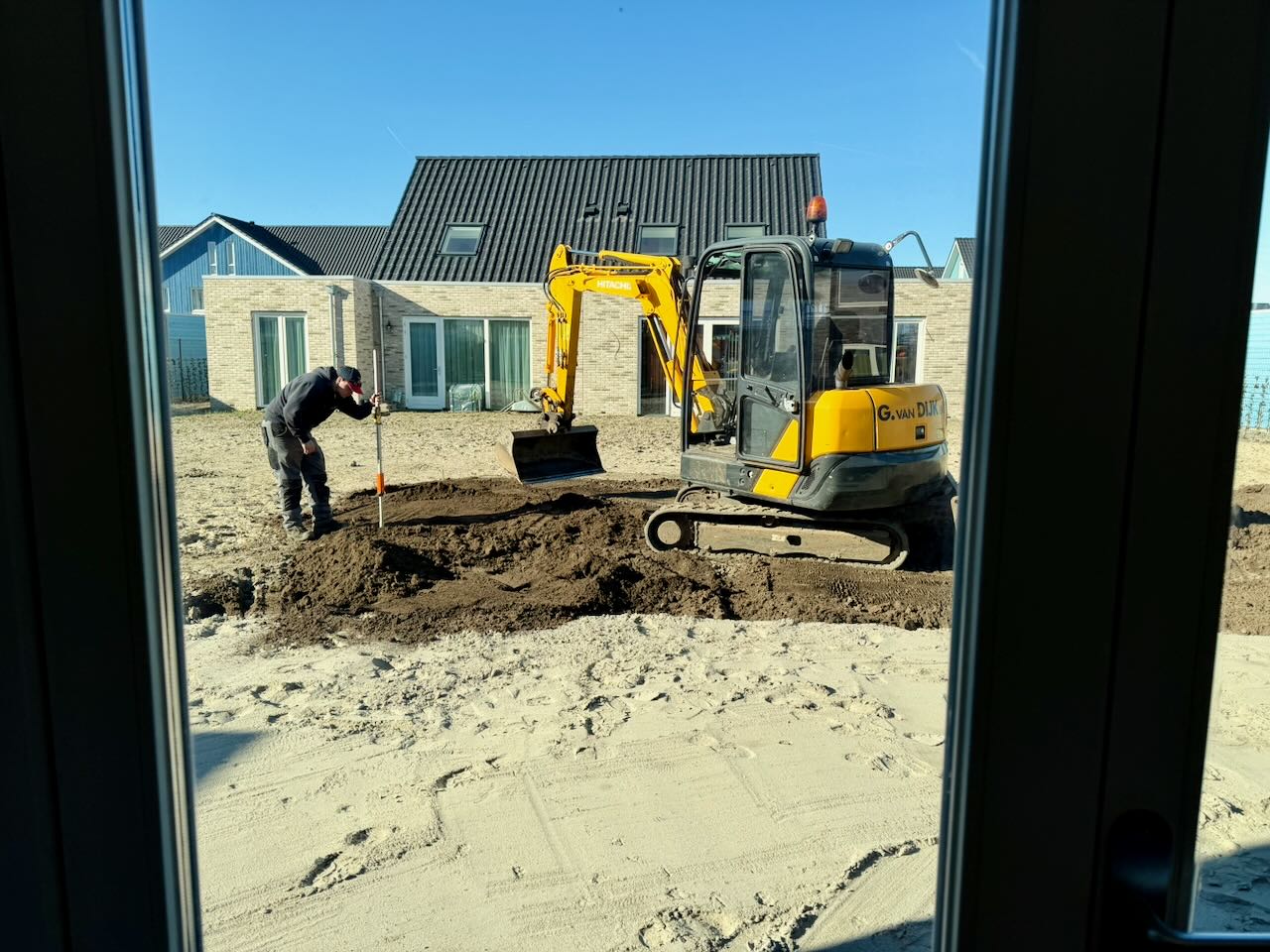En om 07:10 gaat de wekker weer ad, en iets later gaat van Dijk weer met de graafmachines aan de slag. Het is een komen en gaan van vrachtwagens, die grond weghalen, aarde en puin brengen. Even later komt er ook een monteur van Brunyzeel om de keuken af te maken. Tenminste dat was de bedoeling, maar zijn maatje is ziek. Dus hij doet wat hij kan in zijn ééntje, en dat is best veel. Hij plaatst de regaalkast, vervangt een lade, plaatst de deurpanelen op de koelkast, vervangt een frontje, voegt een led-stukje toe zodat alle lampjes nu kunnen branden. Maar hij kan niet het beschadigde tussenpaneel vervangen. Want daarvoor moet de oven en de vriezer er uit. En dan kan ook de koelkastdeur gesteld worden zodat alles gelijk loopt. Dan blijkt dat er wel een nieuwe koelkastdeur moet koen, want er zitten dubbele boorgaten in. Voor 12 uur is ie er weer vandoor en bemerken we dat het zijpaneel niet is gemonteerd zoals wij dat zouden willen. Maar ja over 6 weken komen ze weer langs. In de tuin gaat het op zich voorspoedig, maar hebben ze ook pech. Als ze naar huis willen blijkt de vrachtwagen een lekke band te hebben. Dus Piet Bandenservice gebeld, en die is ruim een uur bezig om een klein lekje te vinden. Ondertussen hangen wij 2 lampjes op in de Pax-kast. En sluiten alle 3 de lampjes aan op de nieuwe driver. Dat werkt wel, maar veel licht heb je er niet van, beetje nutteloos dus. Na het eten halen we alle stucloper en tape van de vloer. Een stuk ruimer zo. Daarna beetje voetbal kijken.