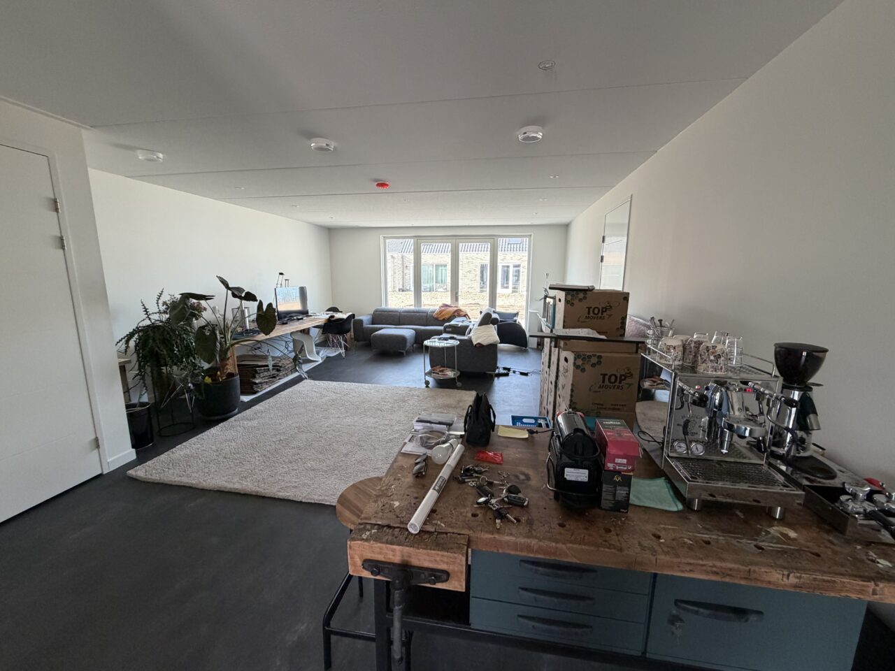 Ik wen er al aan; om 07:10 gaat de wekker weer. En om 07:30 begint er een grondwerker. Hij is de enige vandaag. Maar hij doet wel een hoop. De tuin achter is inmiddels voorzien van zand waar de serre komt en aarde voor het deel wat tuin wordt. Idem opzij voor de schuur en het terras. En de oprit is inmiddels voorzien van puin, aangestampt met de grote graafmachine. Daar moet nog wat zand overheen en daarna komen de open grasstenen. Ook aan de voorkant is het bijna gedaan. Hopelijk gaan ze morgen het overtollige klei en overgebleven zand ophalen. Binnenshuis halen we stucloper overal weg, leggen het kleed neer en verdraaien de werkbank. Eens kijken hoe dat staat. Past prima en ziet er best ruimtelijk uit. Ook weer een rondje stort gedaan en Siel gaat langs bij de Kringloper. Het oude servies kan weg, want het nieuwe is inmiddels binnen. Dat geldt ook voor de dimmer voor de Led-spotjes in de keuken, en voor de 2e afstandsbediening van de screens. Siel gaat vanuit Almere door naar Jo, op de thee. Ik bouw de dimmer in, hang een lamp op en stel het netwerk opnieuw in. Ook de Sonos boxen geven weer geluid en zijn gekoppeld dacht tv.