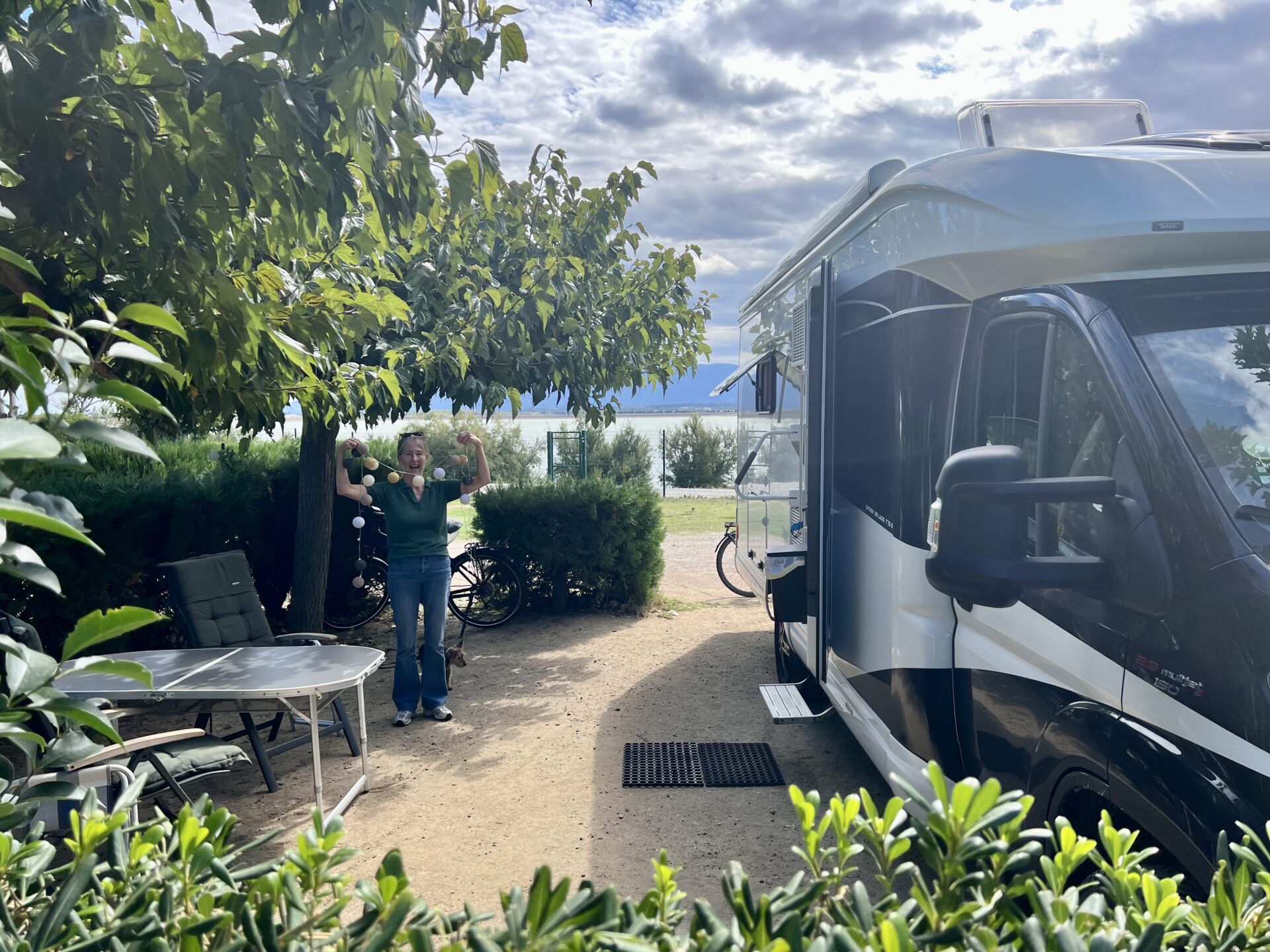 Na het ontbijt houden we het voor gezien in Gruissan. Lozen en de watertank volgooien en dan op pad richting Perpignan, om preciezer te zijn naar een camping in Villeneuve-de-la-Raho, naast het gelijknamige meer. Eerst 4 km daarvoor nog wat inkopen doen bij een mooie InterMarche. Weer wat verse spullen in huis, en hamburgers en een mini-pizza en flammkuchen. Kijken of dat op de bbq wil lukken. De camping ziet er prima uit, we krijgen een mooie plek, met uitzicht op het meer. We installeren ons voor een dag of 4. Maandag nl. naar de garage in Perpignan, en dat is 15 minuten rijden hiervandaan. Dat komt mooi uit want de poort gaat pas open om 8 uur en de afspraak is om al om 08:30. Dus dat past precies (hoop ik). Ik pak de fiets naar de InterMarche want Siel is de Griekse yoghurt vergeten. Bij terugkomst onder de douche en Siel doet een rondje om het meer wandelen. Een dikke 6 km.